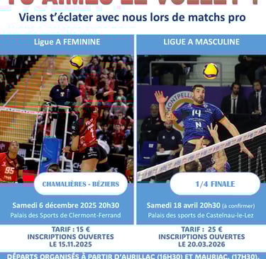 Organisation de déplacements pour assister à des matchs pros (VBC Chamalières, Béziers Angels, Montpellier Hérault Sport Club Volley-Ball).