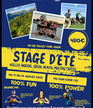 Organisé du 14 au 18 juillet 2025 à Vic-sur-Cère, avec 6h de volley minimum par jour et bien d'autres activités ludiques, encadré par des joueurs pros. Limité à 24 places.