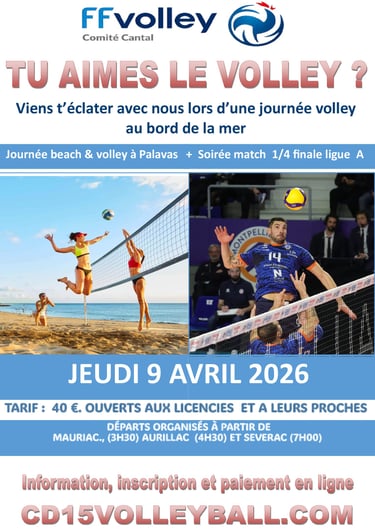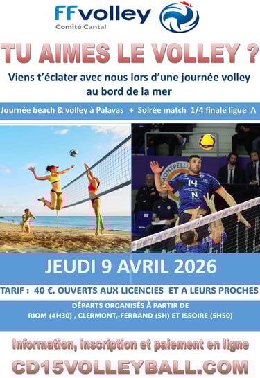 Tarif (enfant, adulte) : 40 € (coût du bus aller/retour, et entrée pour le match). Ouvert aux licenciés FFVB et leurs proches (famille, amis).