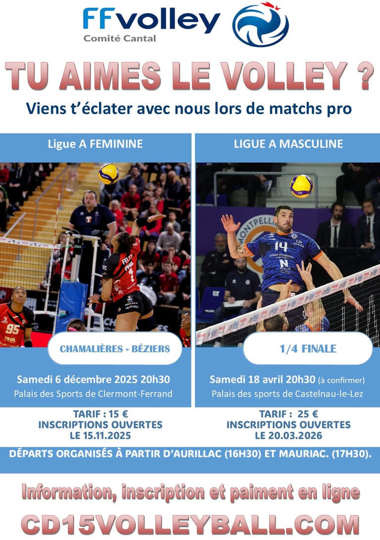 Tarif (enfant, adulte) : 15 € à partir d'Aurillac, 10 € à partir de Mauriac (coût du bus aller/retour, et entrée gratuite pour le match). Ouvert aux licenciés FFVB et UNSS et aux non licenciés.