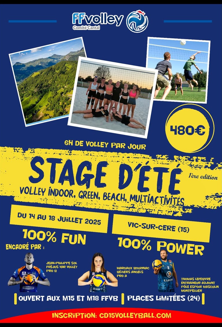 Rejoignez-nous au centre de vacances ORTF (France Télévision, Radio France) à Vic-sur-Cère pour le stage estival de volley (salle, plage et green), prévu du 14 au 18 juillet 2025.